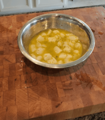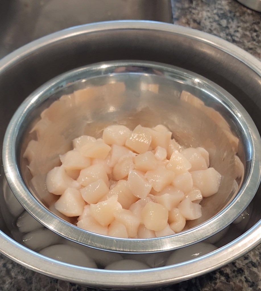 If you are using bay scallops they will be small enough to leave whole, but if you are using anything bigger, you will want to slice them into quarters.