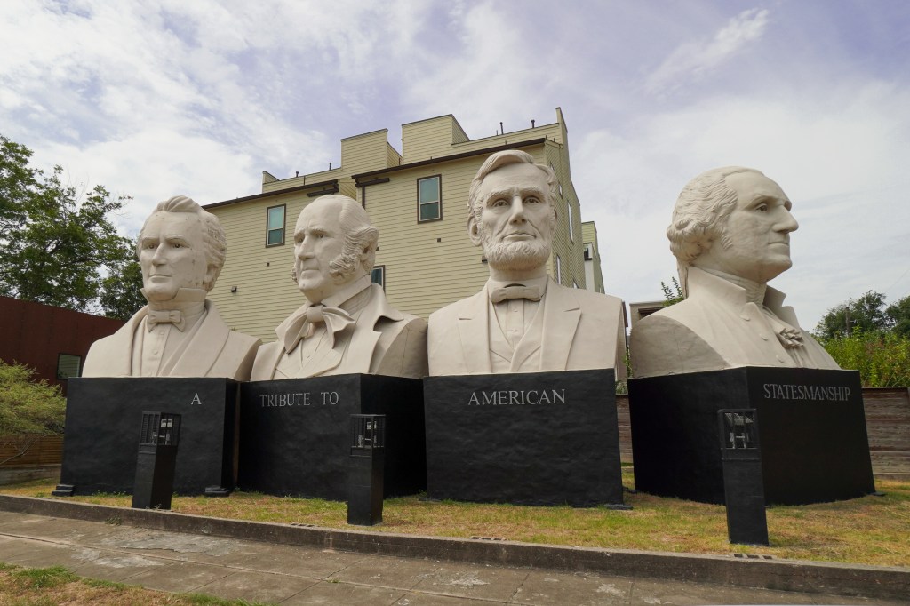 We visited a unique piece nicknamed “Mount Rush-hour,” a Lone-Star-State-skewed version of Mount Rushmore at a notorious Houston bottleneck. The giant busts are “A Tribute to American Statesmanship.” according to the artist and gives you something to distract you from the endless Houston traffic.