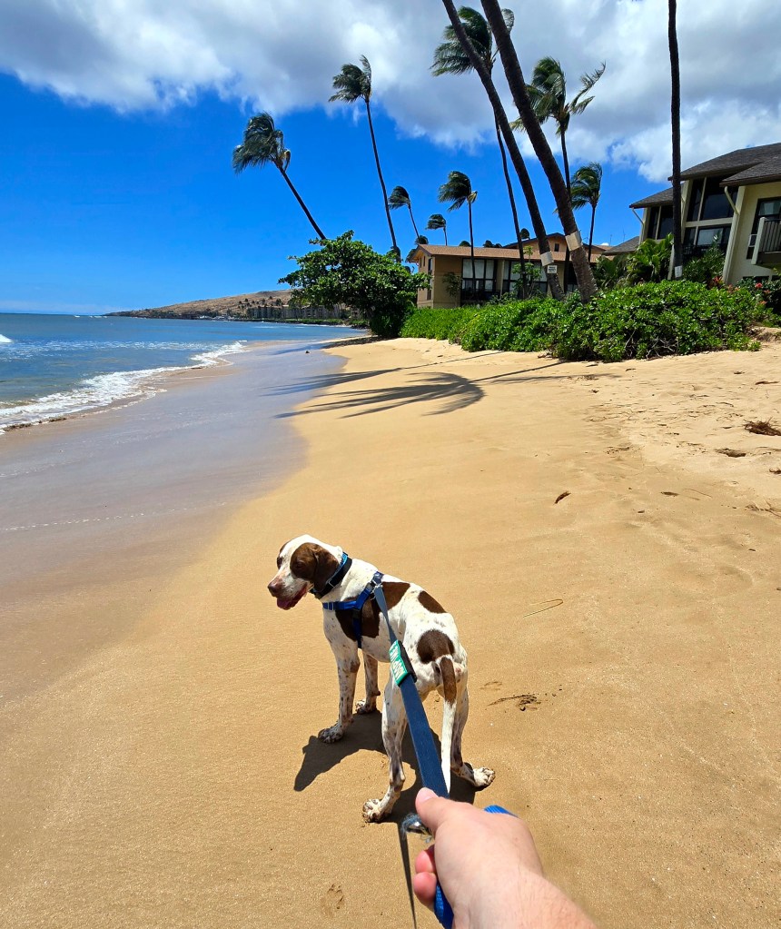 That afternoon, we did something a little different: we participated in the Maui Humane Society’s Beach Buddies program, taking a shelter dog named Kyle out for a day of adventure. From beach time to a dog-friendly coffee shop, it was a heartwarming and memorable experience.